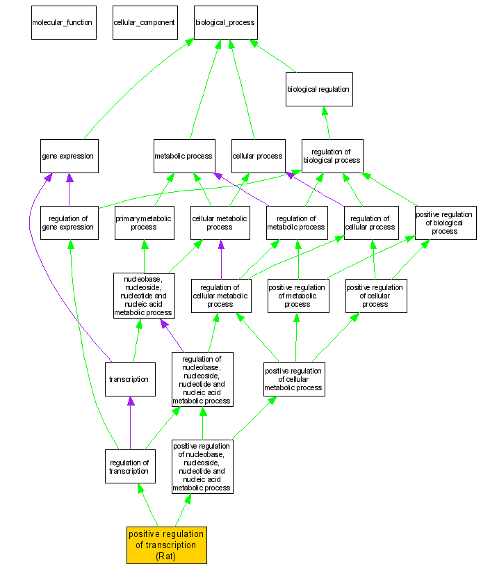 Green arrows indicate "is_a"; Purple arrows indicate "part_of"