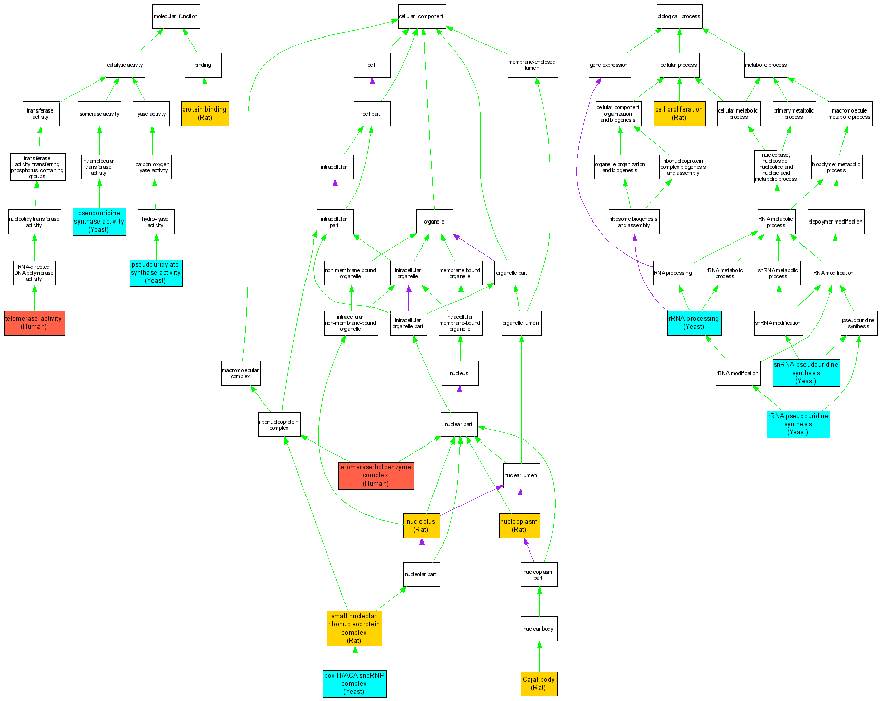 Compare GO annotations related to Dyskeratosis congenita-1 using OMIM genes and OrthoDisease orthologs