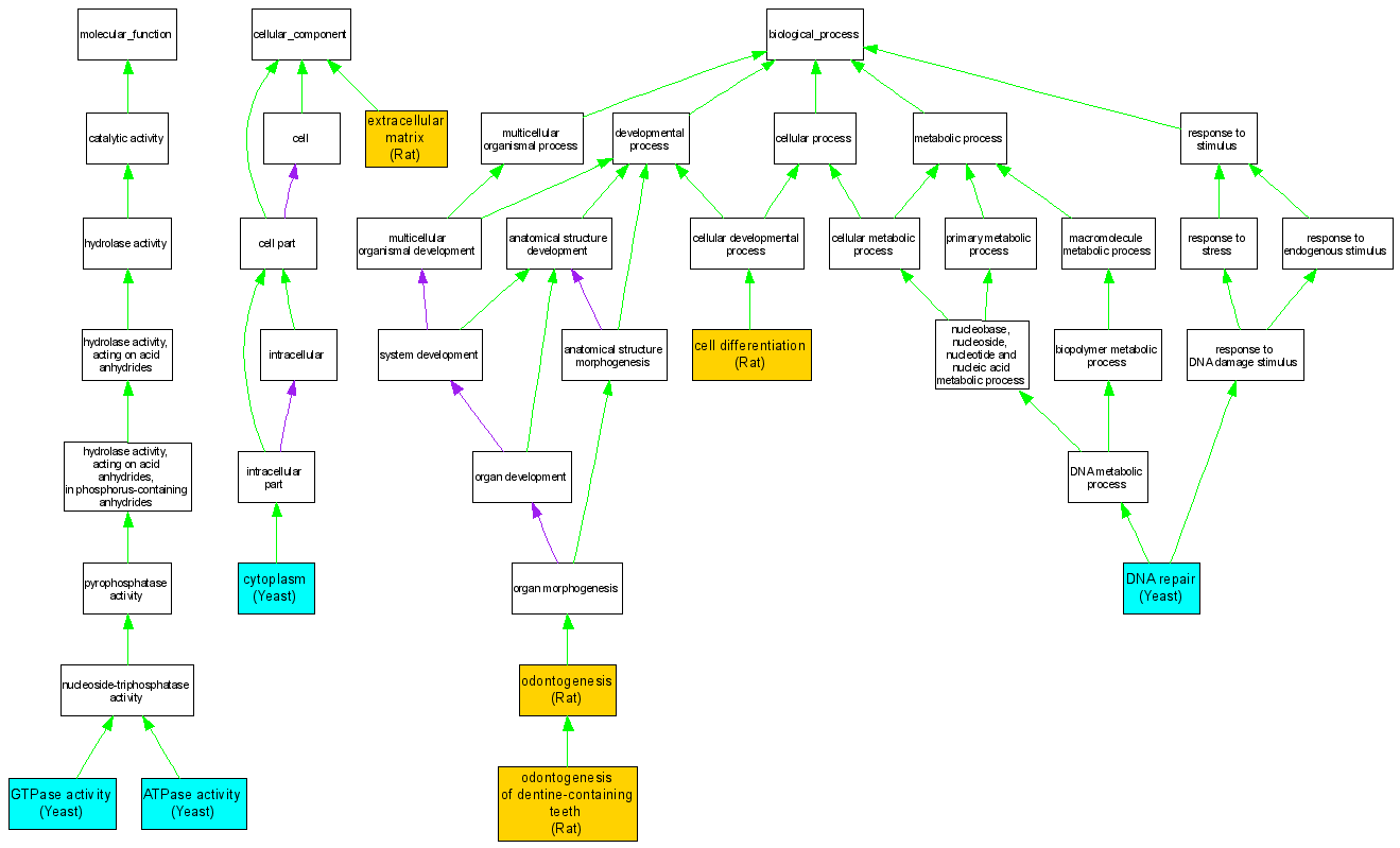 Compare GO annotations related to Deafness, autosomal dominant 36, with dentinogenesis using OMIM genes and OrthoDisease orthologs