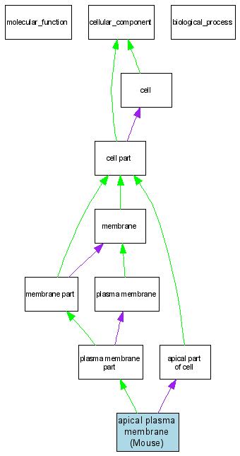 Green arrows indicate "is_a"; Purple arrows indicate "part_of"