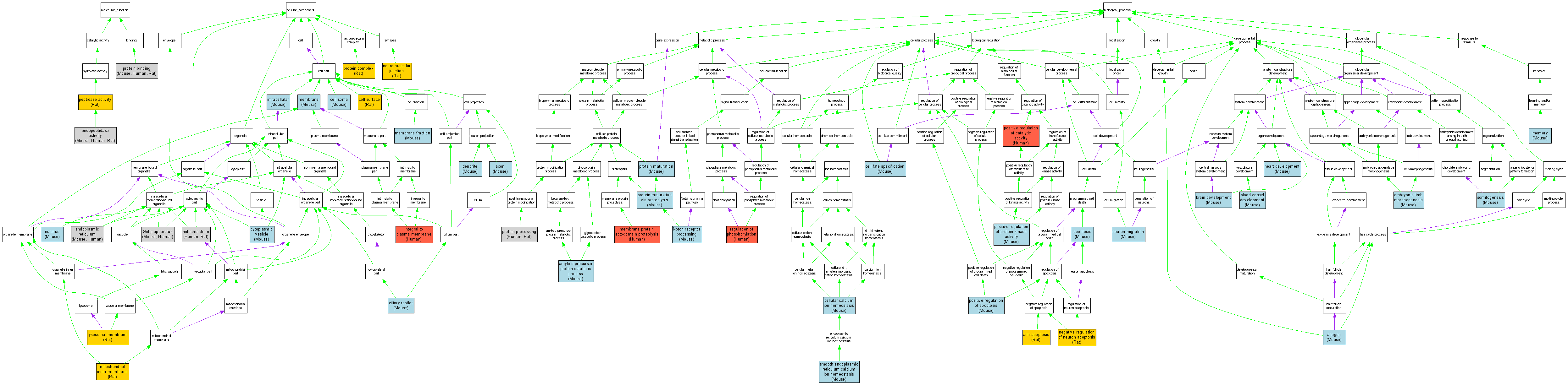 Compare GO annotations related to Alzheimer disease, type 3, with spastic paraparesis and unusual plaques using OMIM genes and OrthoDisease orthologs