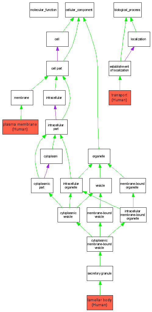 - Green arrows indicate "is_a"; Purple arrows indicate "part_of"