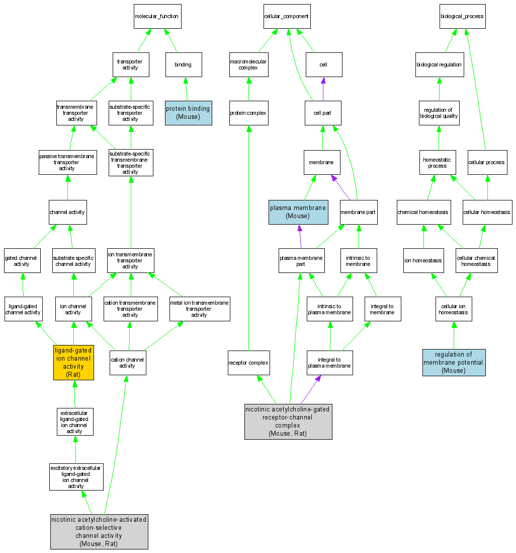 | Molecular Function | GO:0004889 | nicotinic acetylcholine-activated cation-selective channel activity |
