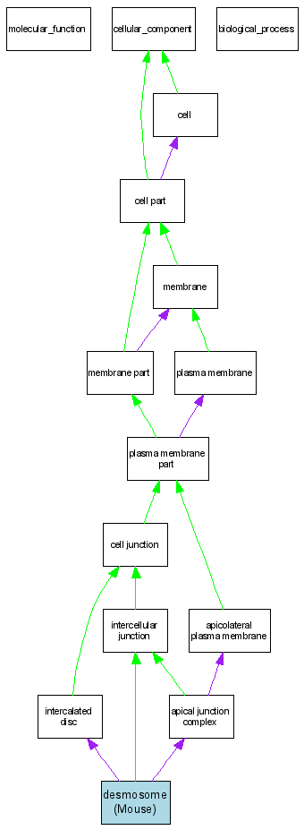 Green arrows indicate "is_a"; Purple arrows indicate "part_of"