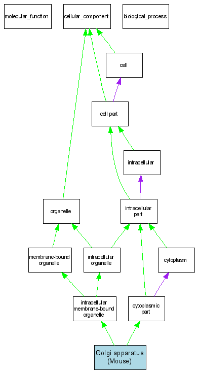 Green arrows indicate "is_a"; Purple arrows indicate "part_of"