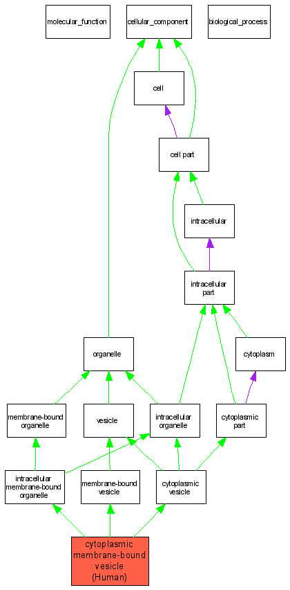 Green arrows indicate "is_a"; Purple arrows indicate "part_of"