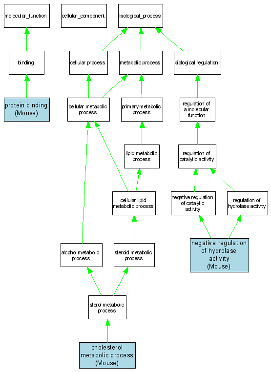| Biological Process | GO:0008203 | cholesterol metabolic process | MGI:104993 | IGI | Mouse | MGI:MGI:3588626|PMID:15995171 |