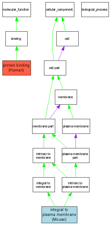 Green arrows indicate "is_a"; Purple arrows indicate "part_of"