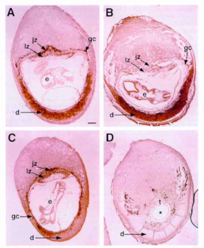 Intense staining is seen in the giant trophoblast cells, the syncytiotrophoblasts of the developing labyrinthine zone and the spongiotrophoblasts of the junctional zone.