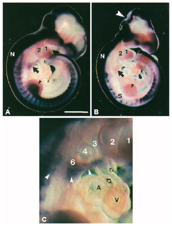 Pax-3 positive cels were observed in control embryos within pharyngeal arches 4 and 6, at the junction of the aortic sac.