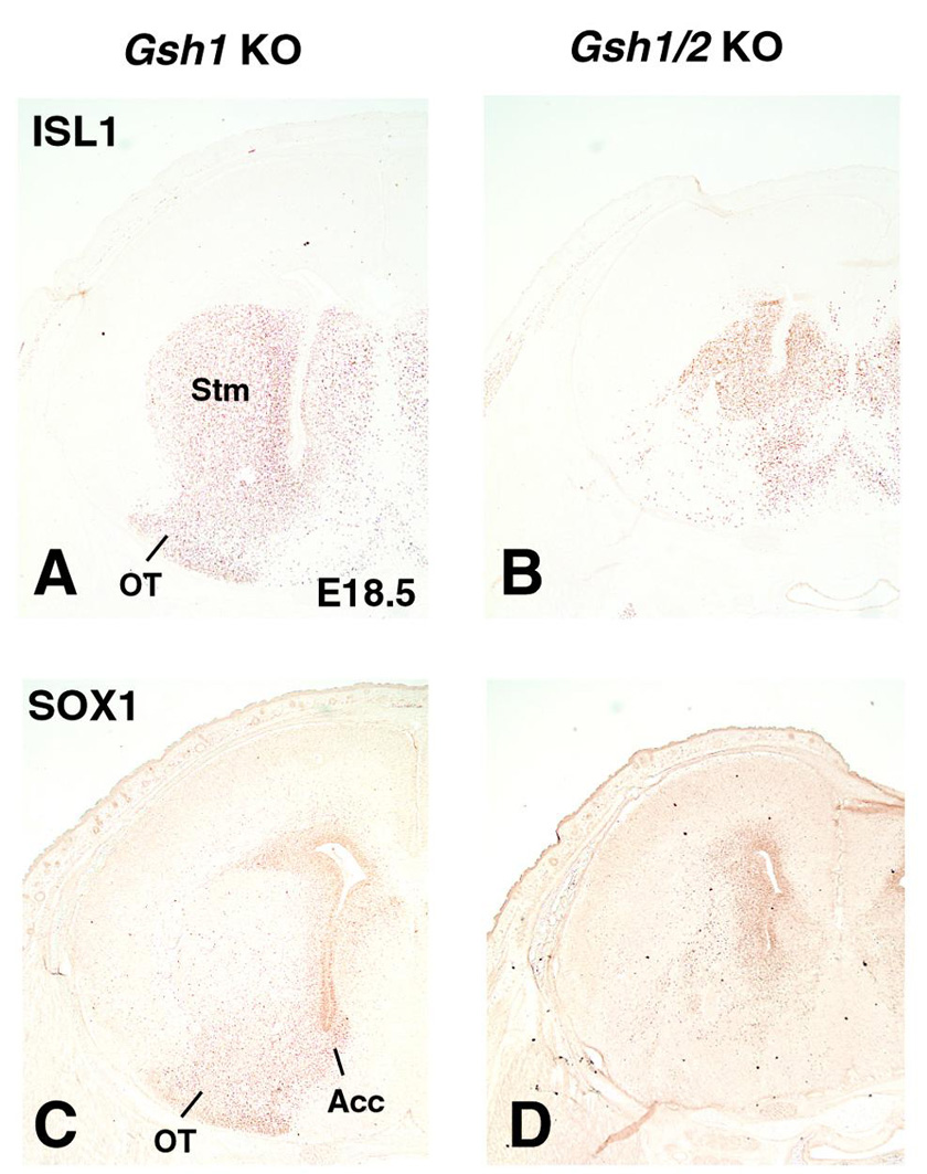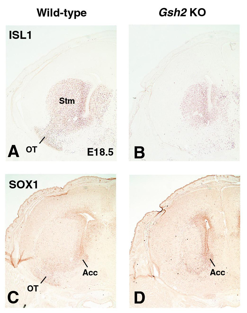 Toresson H, et al., A role for Gsh1 in the developing striatum and olfactory bulb of Gsh2 mutant mice. Development. 2001 Dec;128(23):4769-80