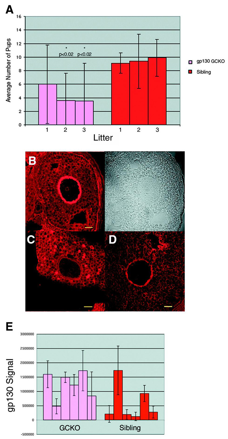 Reference: J:84598 Molyneaux KA, et al., GP130, the shared receptor for the LIF/IL6 cytokine family in the mouse, is not required for early germ cell differentiation, but is required cell-autonomously in oocytes for ovulation. Development. 2003 Sep;130(18):4287-94