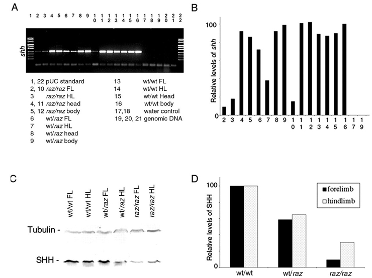 (a) Age of embryo at noon of plug day not specified in reference. (b) Authors report a definitive, low level of expression (10-20% of wt/wt), that was posteriorly restricted (data not shown). (c) Authors state that expression was 40-80% that of wt/wt. |