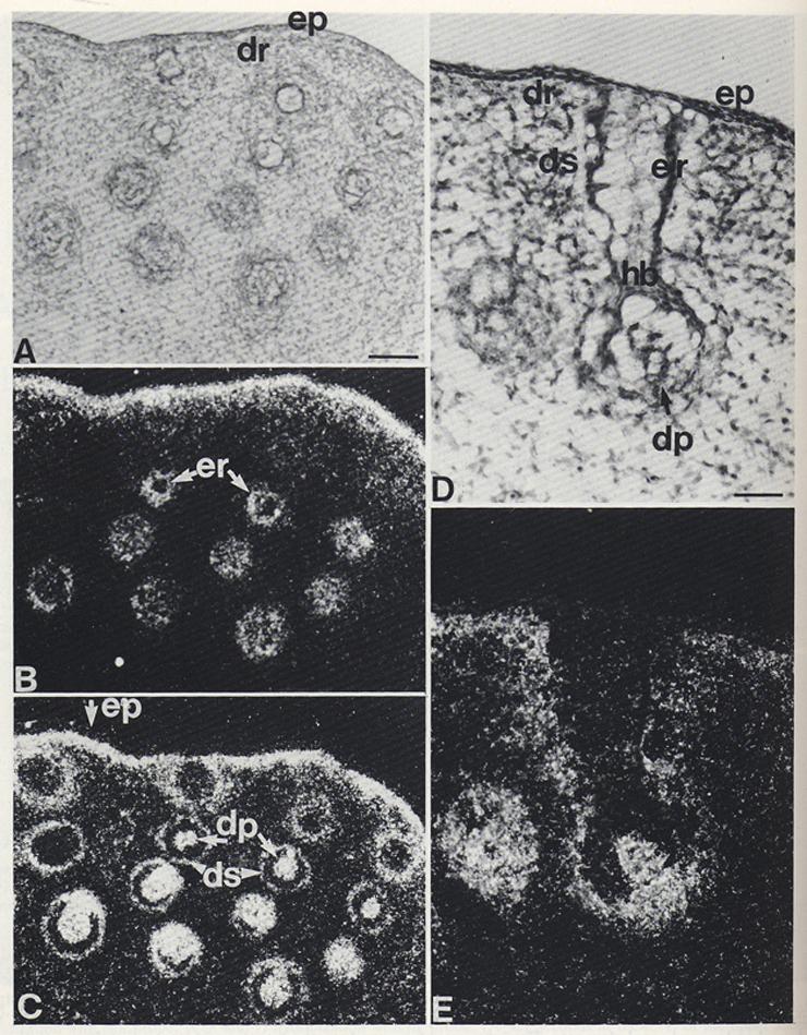 TS22: dermis Present Regionally restricted 10E Expression is present in the mesenchyme of the prospective dermis, as well as its derivatives the dermal papilla and sheath.