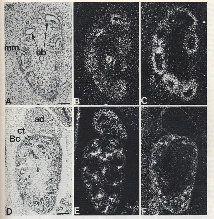 TS22: mesenchyme of metanephros Present Regionally restricted 9F Expression is present in the mesenchymal elements in the cortical areas of the embryonic kidney.