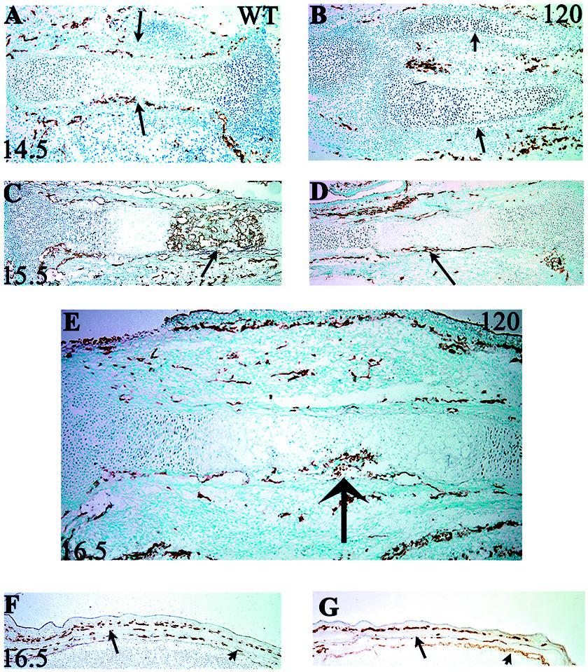 TS22: blood vessel Present Regionally restricted 3B Expression was detected in vessels, but unlike wild type, they remain far from the surface of the tibia and fibula.