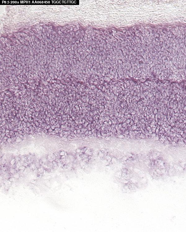 TS24: retina nuclear layer Present Regionally restricted Submitted Image - mph1E16.5 Expression was detected in the scleral inner neuroblastic layer and the outer neuroblastic layer. The expression level was higher in the outer neuroblastic layer.