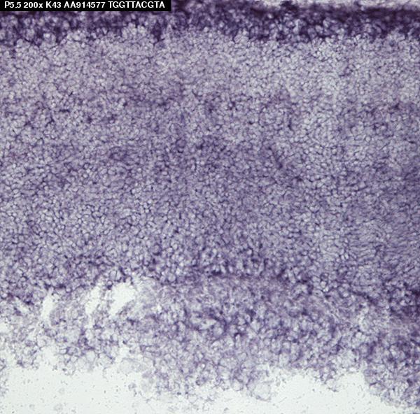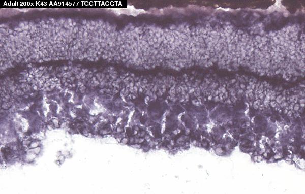 TS28: retina Present Regionally restricted Submitted Image - K43p5.5 Expression was panretinal, but the level was higher in the extreme outer scleral outer neuroblastic layer.