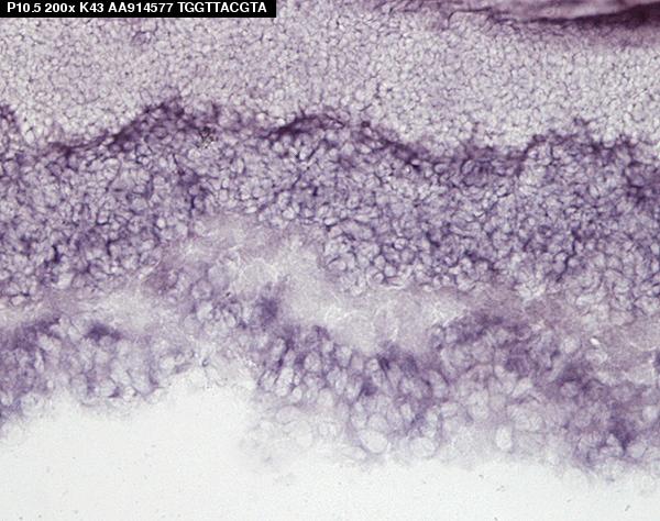 TS28: retina inner nuclear layer Present Submitted Image - K43p10.5 Expression was detected in the inner nuclear layer and tentatively in amacrine cells.