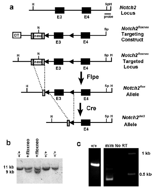 m/m E10.5 TS17: embryo Absent Present (b) 2-3 µg; total RNA involves: 129S1/Sv * C57BL/6J Notch2tm3.1Grid/Notch2tm3.1GridNot Specified