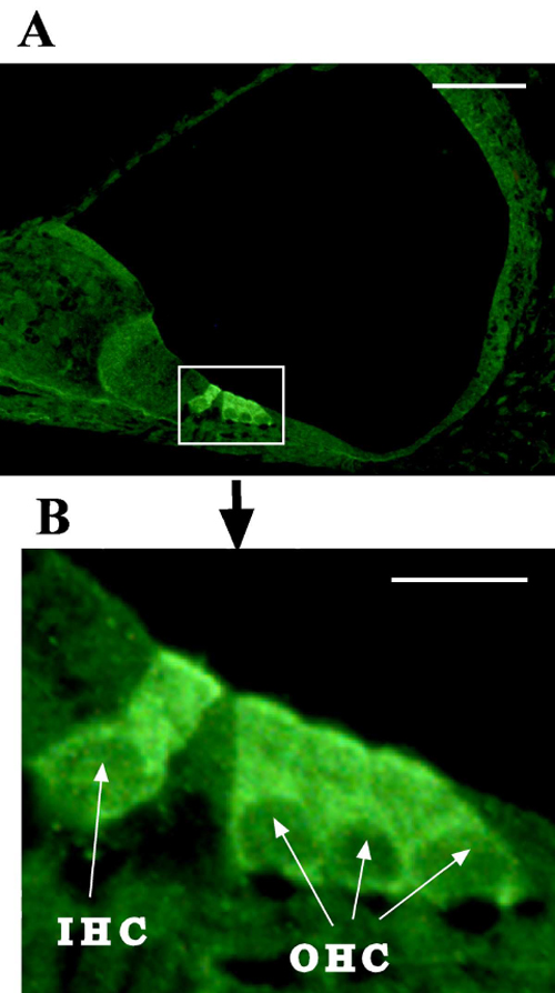 Expression is present throughout the cell body in both the inner and outer hair cells.
