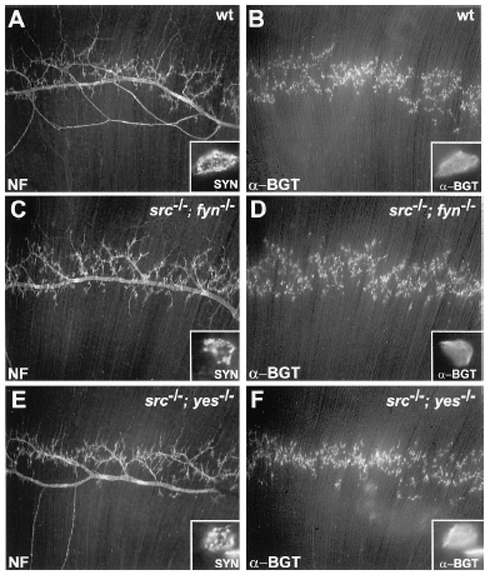 Smith CL, et al., Src, Fyn, and Yes are not required for neuromuscular synapse formation but are necessary for stabilization of agrin-induced clusters of acetylcholine receptors. J Neurosci. 2001 May 1;21(9):3151-60