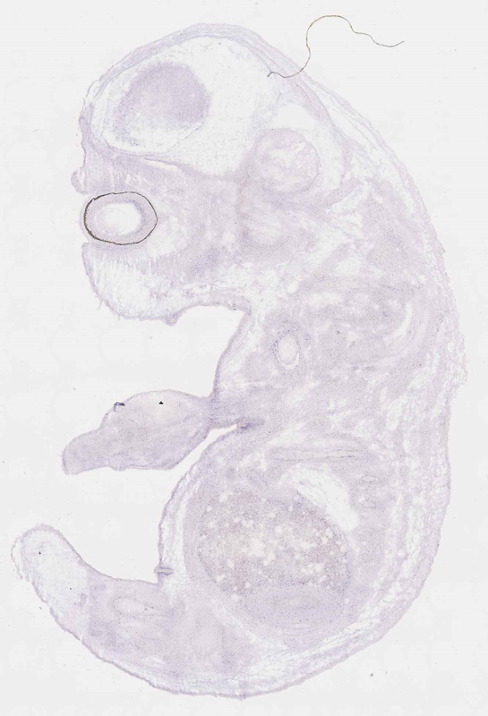 Assay notes: Specimen information for this assay was downloaded from GenePaint (www.genepaint.org). Cryosections of fresh frozen material were fixed in 4% paraformaldehyde for 20 min. before further processing. A tyramidebiotin/streptavidin amplification step was included in the in situ hybridization procedure.
