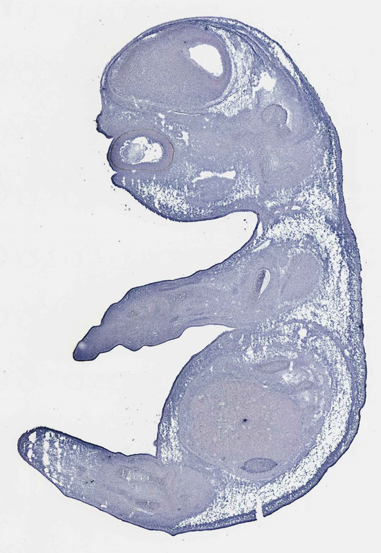 Assay notes: Specimen information for this assay was downloaded from GenePaint (www.genepaint.org). Cryosections of fresh frozen material were fixed in 4% paraformaldehyde for 20 min. before further processing. A tyramidebiotin/streptavidin amplification step was included in the in situ hybridization procedure.