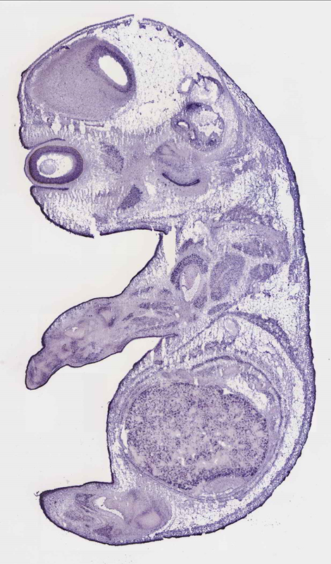 Assay notes: Specimen information for this assay was downloaded from GenePaint (www.genepaint.org). Cryosections of fresh frozen material were fixed in 4% paraformaldehyde for 20 min. before further processing. A tyramidebiotin/streptavidin amplification step was included in the in situ hybridization procedure.