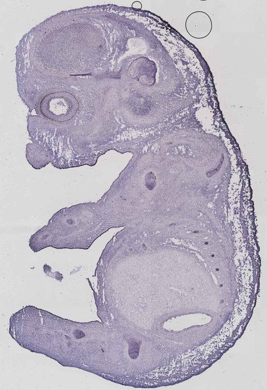 Assay notes: Specimen information for this assay was downloaded from GenePaint (www.genepaint.org). Cryosections of fresh frozen material were fixed in 4% paraformaldehyde for 20 min. before further processing. A tyramidebiotin/streptavidin amplification step was included in the in situ hybridization procedure.