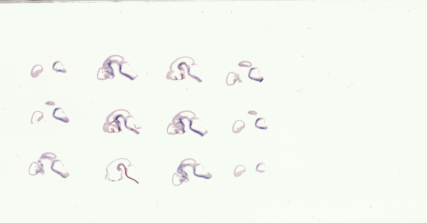 There is weak staining in the mantle zone of the ganglionic eminences. Staining is either absent or ubiquitous in the ventricular zone of the ganglionic eminences.