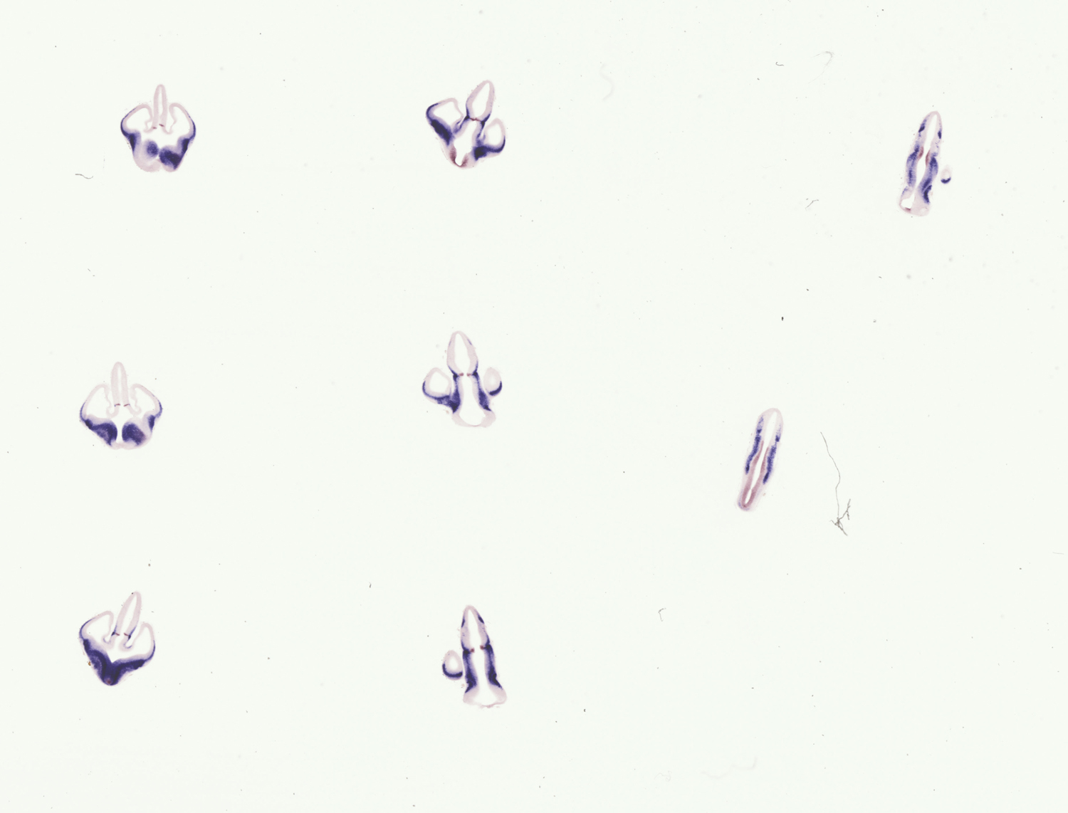 Staining is either absent or ubiquitous in the ventricular zone of the premam, mam and supramam zones.