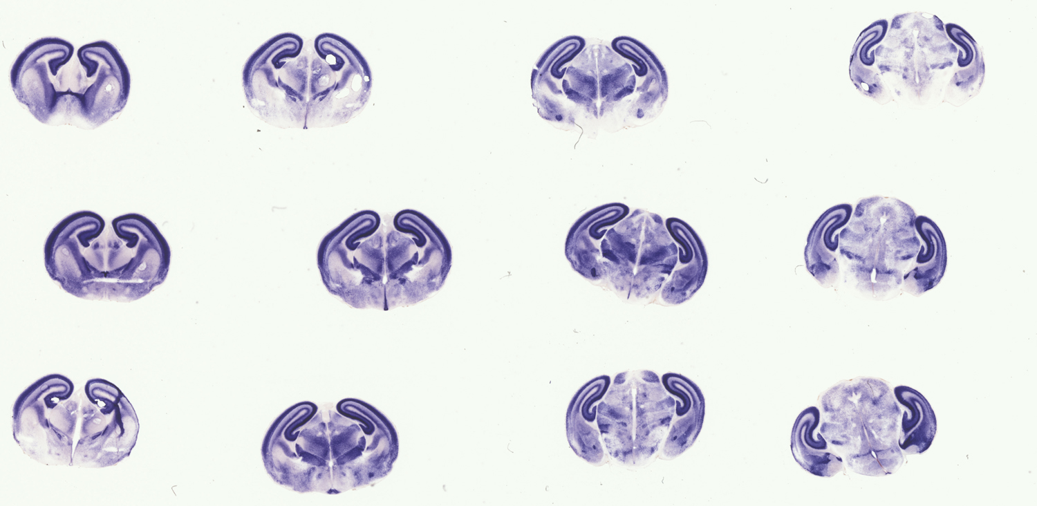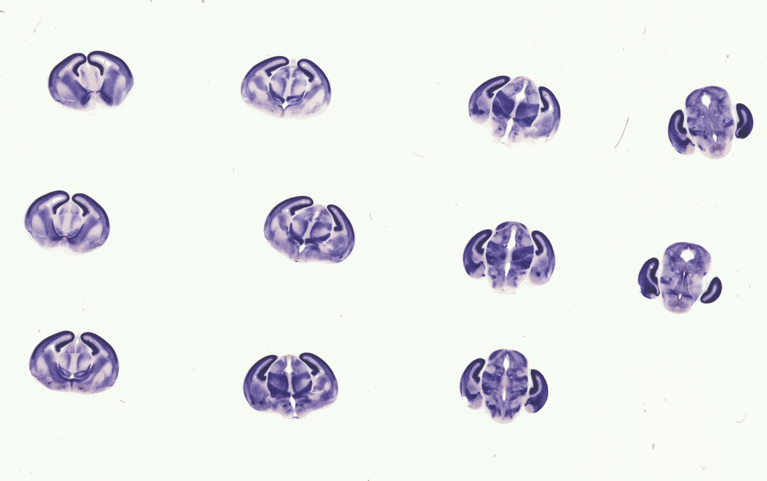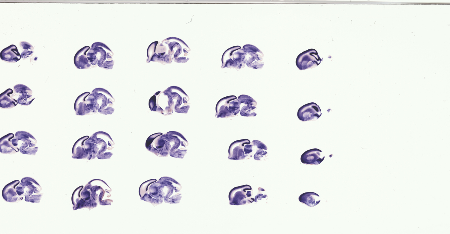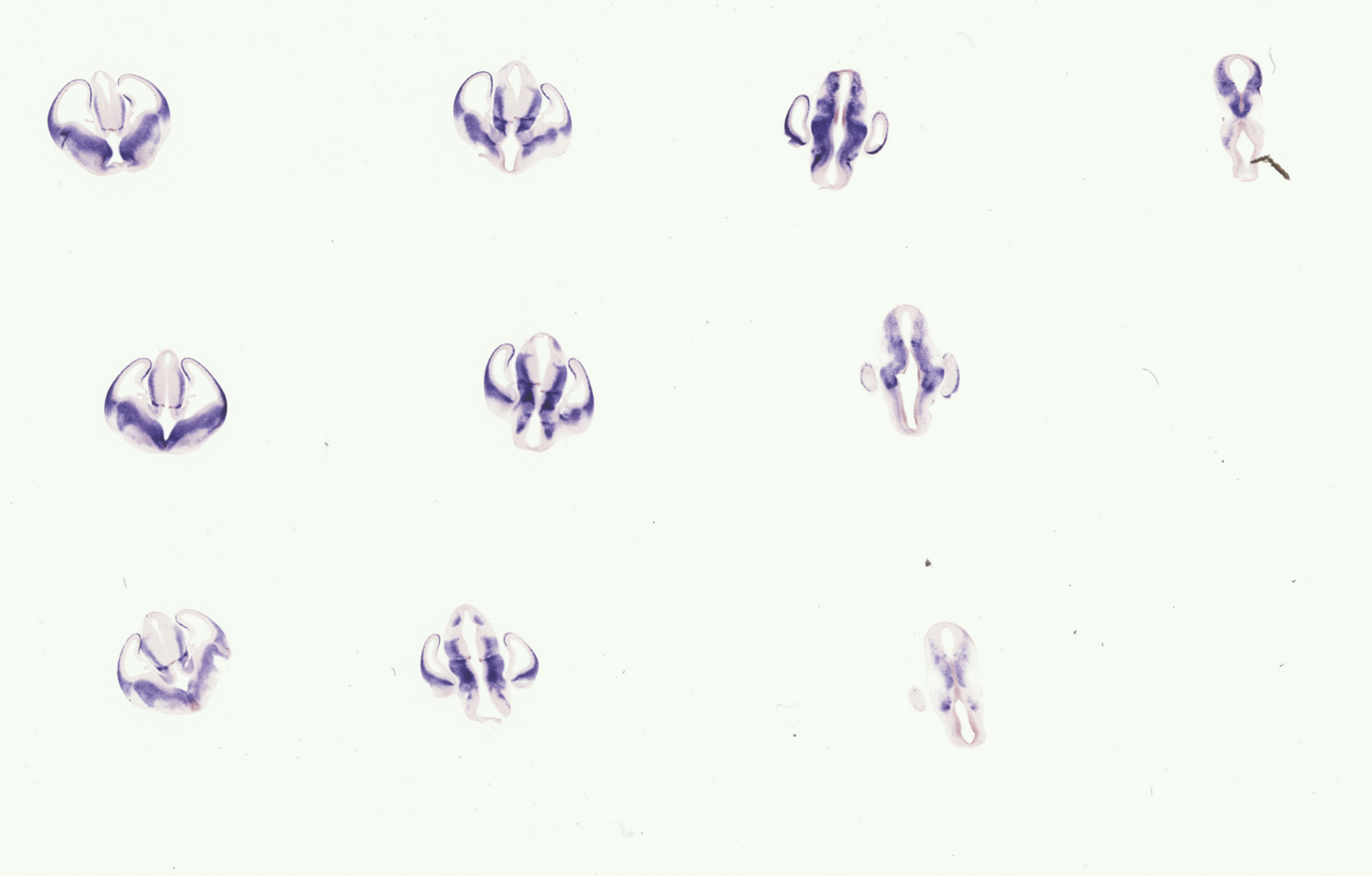 There is weak staining in the mantle zone of the ganglionic eminences. Staining is either absent or ubiquitous in the ventricular zone of the ganglionic eminences.
