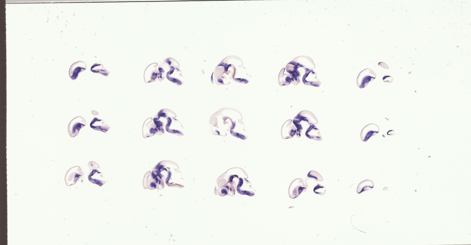 There is moderate staining in the mantle zone of the ganglionic eminences. Staining is either absent or ubiquitous in the ventricular zone of the ganglionic eminences.