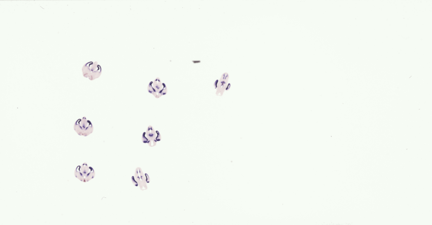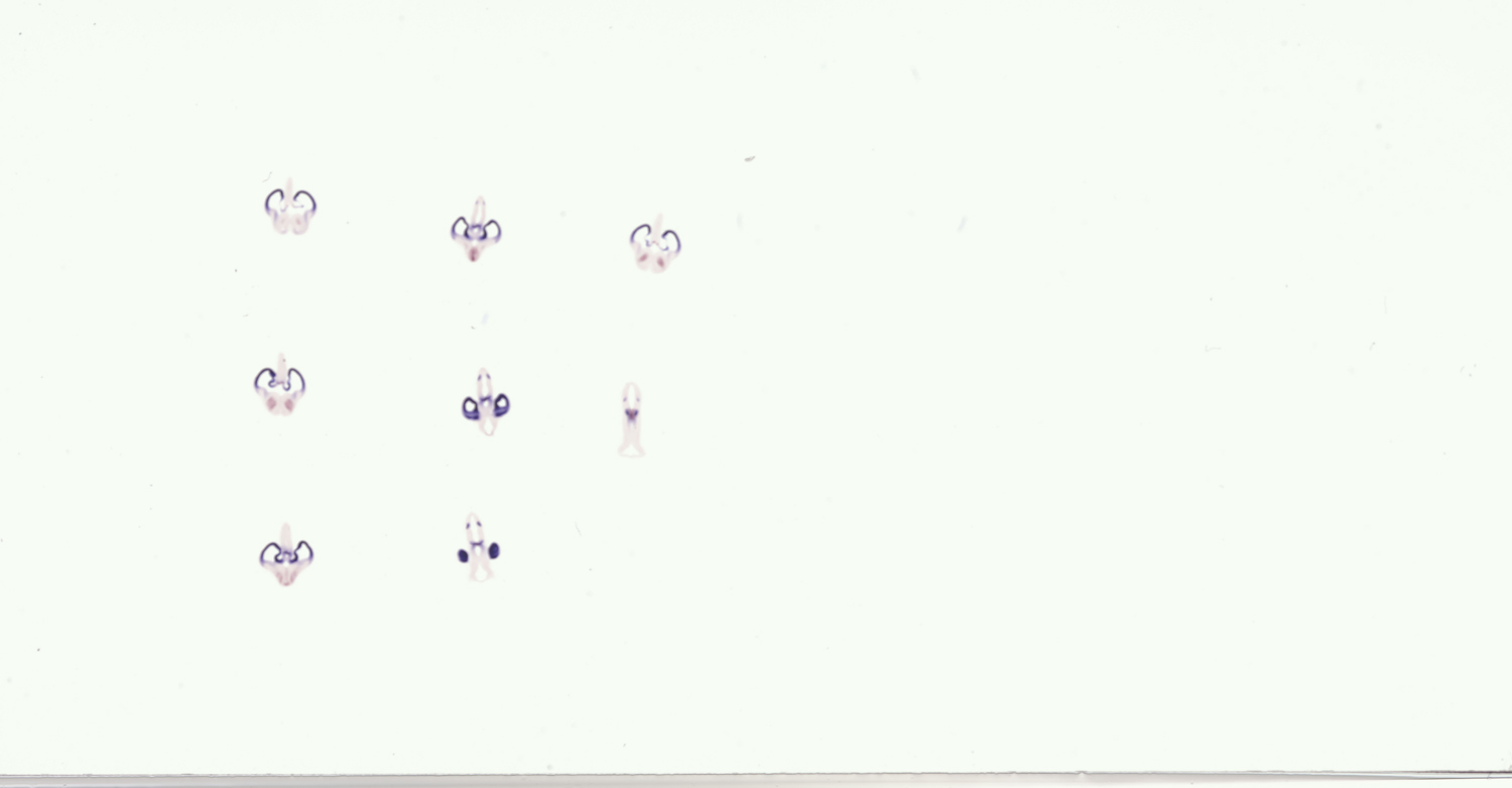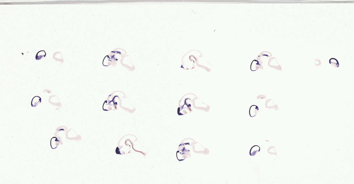 Assay notes: These specimens were also hybridized with a fluorescein-labeled Shh probe MGI:2110655; detected with TBT/BCIP. The results are reported in Supp. Table 4, whose legend includes a key to the abbreviations used and more fully details the regions examined.
