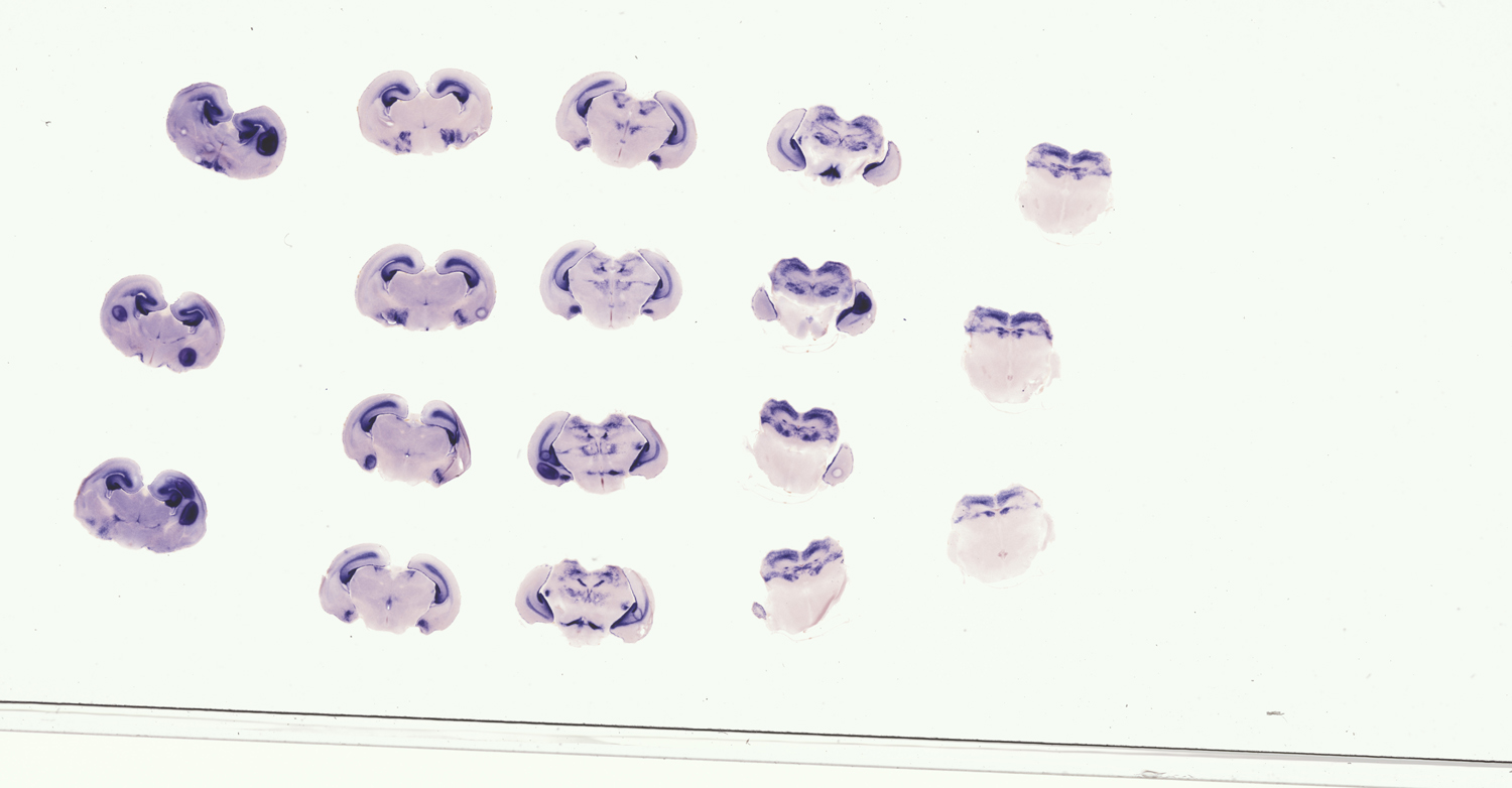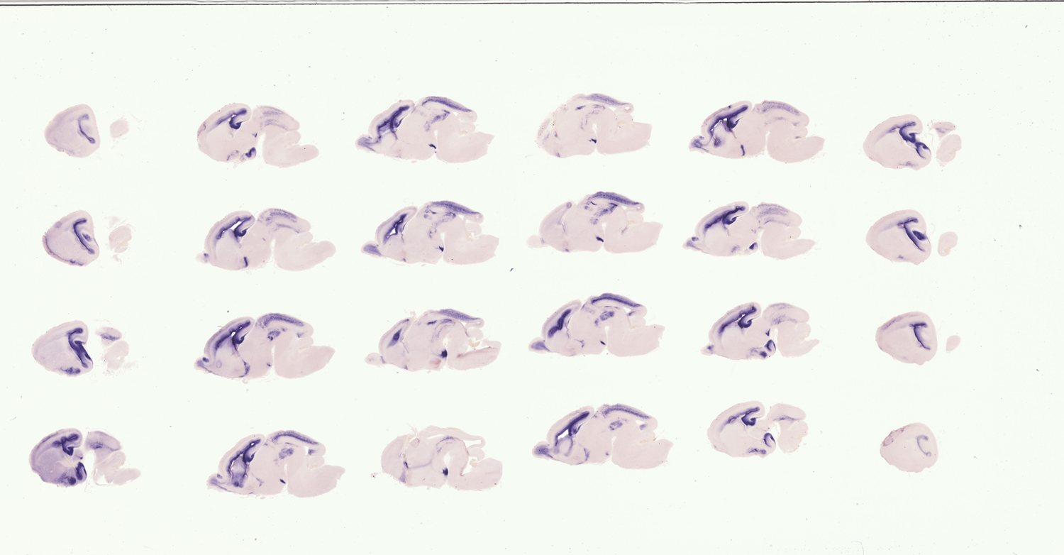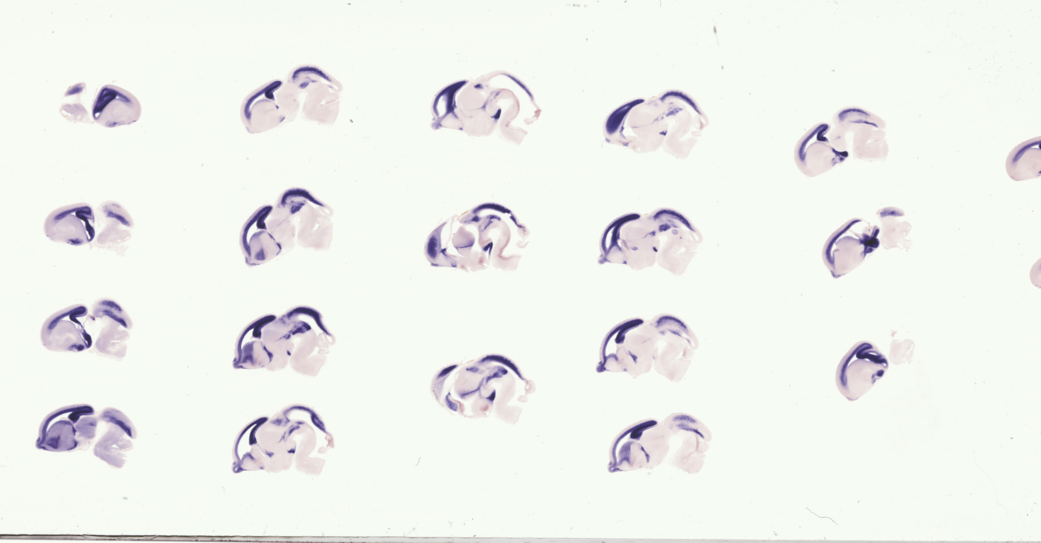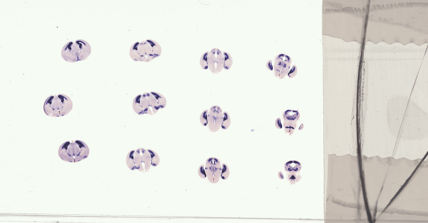 Assay notes: These specimens were also hybridized with a fluorescein-labeled Shh probe MGI:2110655; detected with TBT/BCIP. The results are reported in Supp. Table 4, whose legend includes a key to the abbreviations used and more fully details the regions examined.