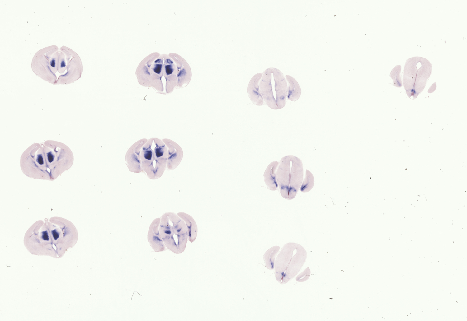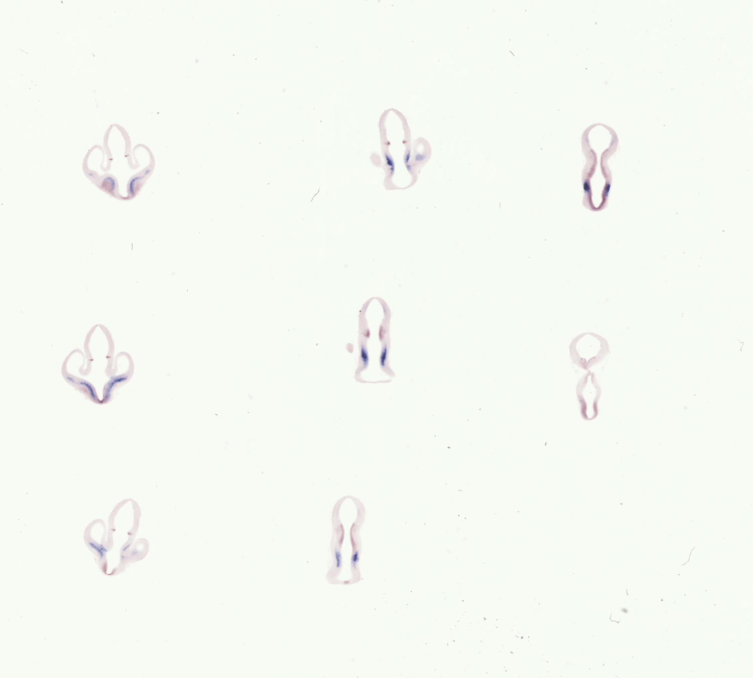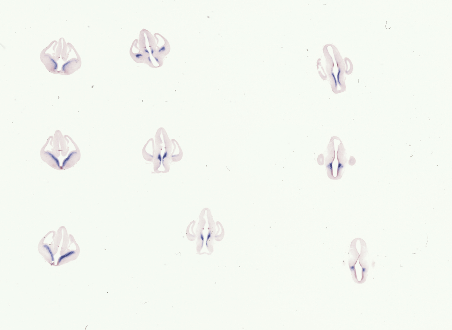 Assay notes: These specimens were also hybridized with a fluorescein-labeled Shh probe MGI:2110655; detected with TBT/BCIP. The results are reported in Supp. Table 4, whose legend includes a key to the abbreviations used and more fully details the regions examined.