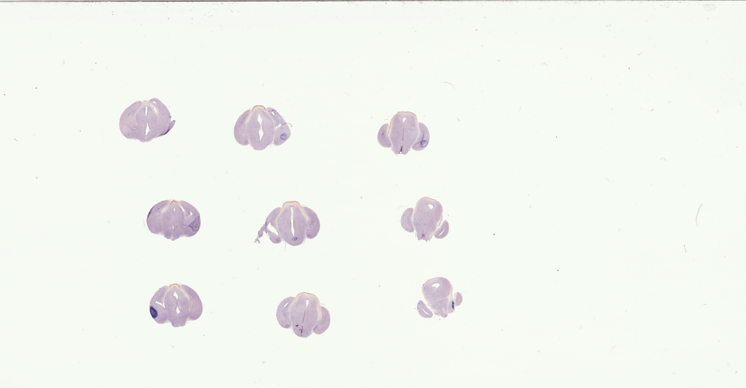 There is moderate, scattered staining in the ventricular zone of the cerebral cortex and the ganglionic eminences.