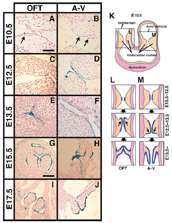 TS21: endocardial tissue Present S1_E Expression is detected exclusively in the endocardium, in this case in the outflow tract valves and surrounding cells. It is not present in the mesenchyme.