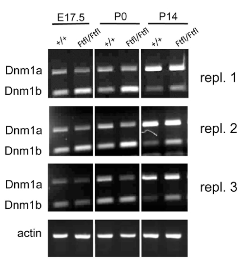 (a) Age of embryo at noon of plug day not specified in reference. (b) Corresponds to the undigested Dnm1a transcript. (c) The Dnm1a transcript becomes increasingly upregulated during development. (d) This is one of the two bands representing the digested Dnm1b transcript. (e) There is a delay in upregulation of the Dnm1a transcript during development in the mutants. |