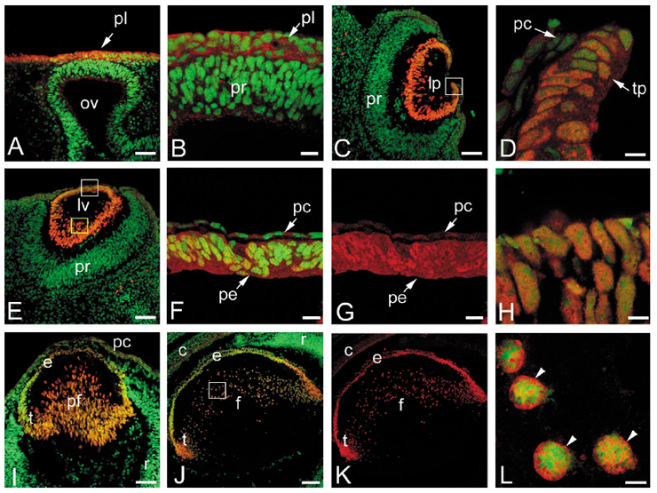 Note: (B) Higher magnification of the lens placode and optic vesicle shown in A. Double labeled: red - Prox1; green - DNA.