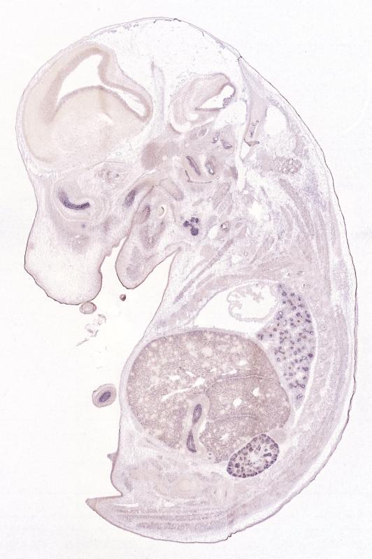 Assay notes: Cryosections of fresh frozen material were fixed in 4% paraformaldehyde for 20 min. before further processing. A tyramide-biotin/streptavidin amplification step was included in the in situ hybridization procedure. These data were downloaded from GenePaint.org on 1/30/12.