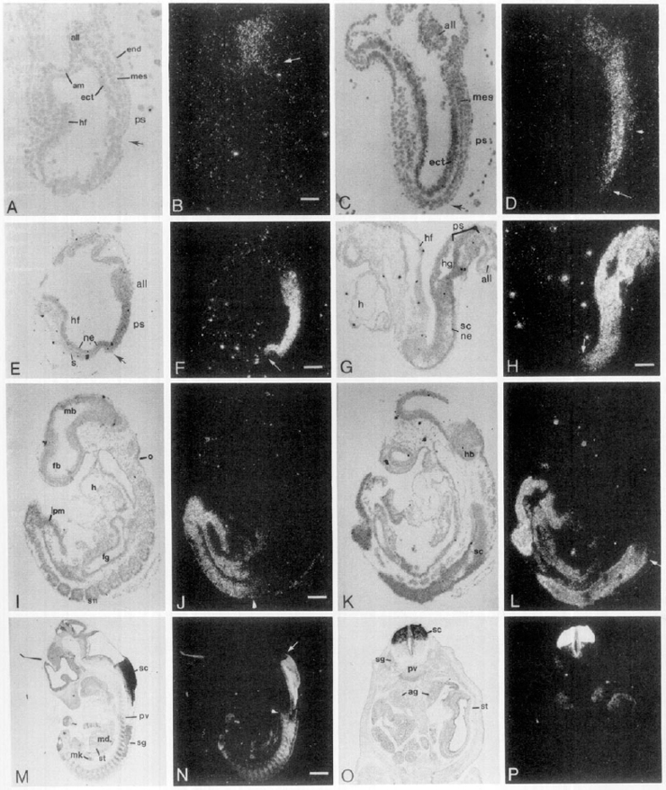 TS11: primitive streak Strong Regionally restricted 3E/F The rostral extermity of the expression domain in the ectoderm was more anterior than in the mesoderm. Expression decreased in the mesoderm of more anterior sections.