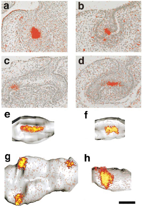 Strong expression in the primary enamel knot, extending over 200 micrometers mesiodistally.