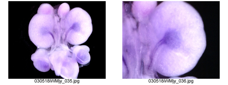 Note: This specimen was generated and annotated by the lab of Andrew P. McMahon, University of Southern California. Labeling was visualized using BM purple. GUDMAP Editorial Office observation: the probe used in this assay does not look to have worked very well. Whilst the annotations indicate lower urinary tract expression, the images do not support this. Another probe for this gene (MTF#1380) shows very strong lower urinary tract expression (see MGI:5539848; GUDMAP:13865).