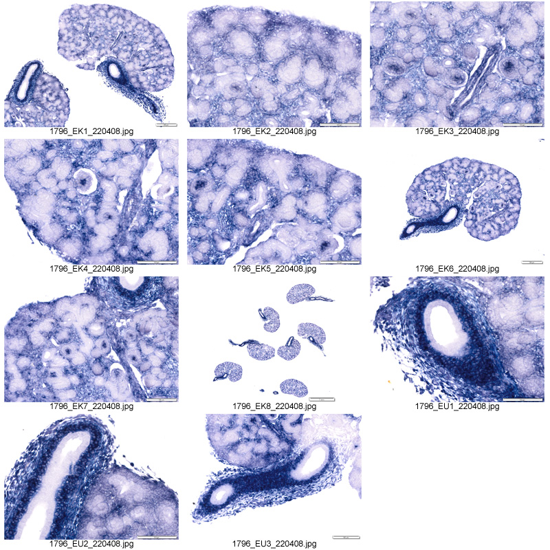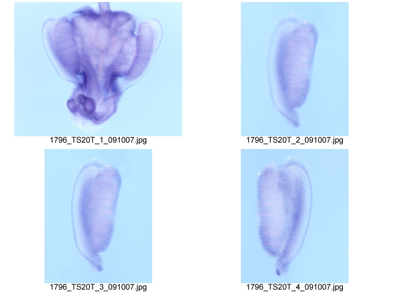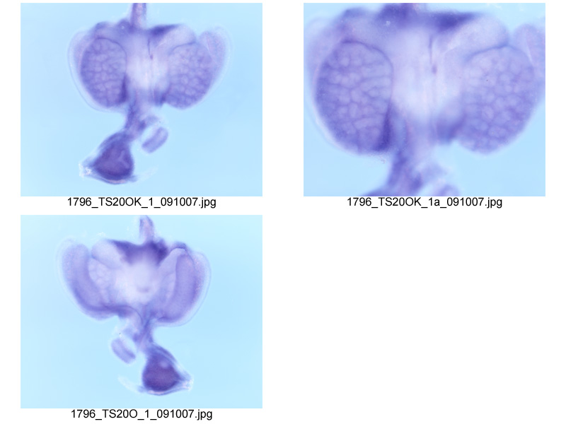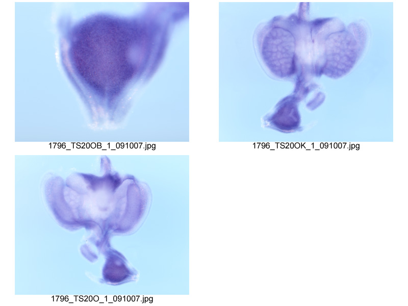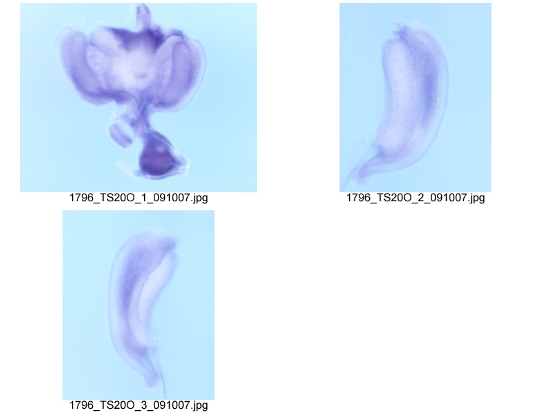 Note: This specimen was generated and annotated by the lab of Melissa H. Little, Murdoch Children's Research Institute. This animal was sexually mature. Visualized using BM purple. The low level expression control (Shh) probe's color developed for 130 hrs. However, expression could not be detected. Thus, low levels of expression are not detectable in this experiment.
