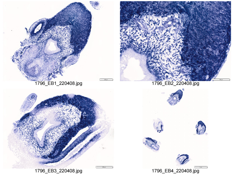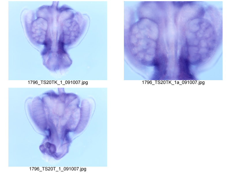 Note: This specimen was generated and annotated by the lab of Melissa H. Little, Murdoch Children's Research Institute. Labeling was visualized using BM purple. The low level expression control (Shh) probe's color developed for 130 hrs. However, expression could not be detected. Thus, low levels of expression are not detectable in this experiment.