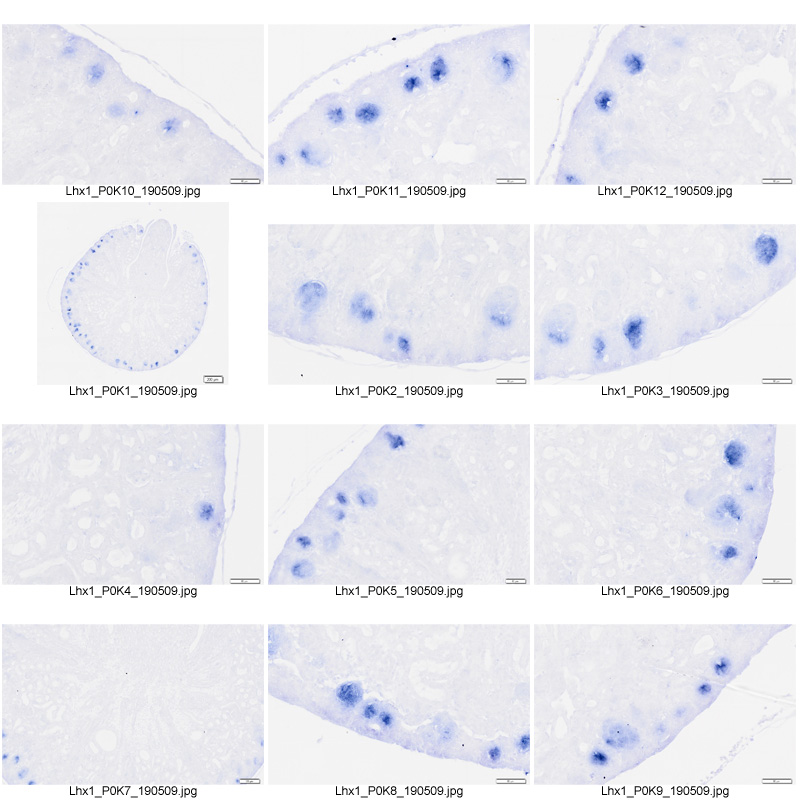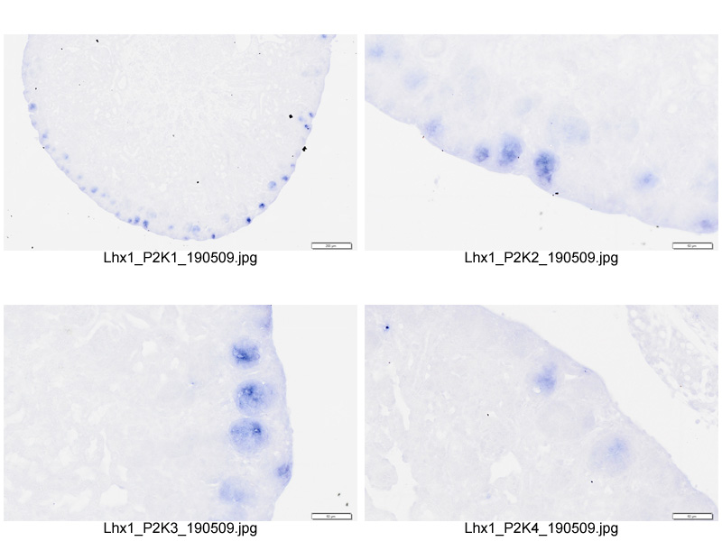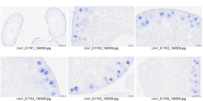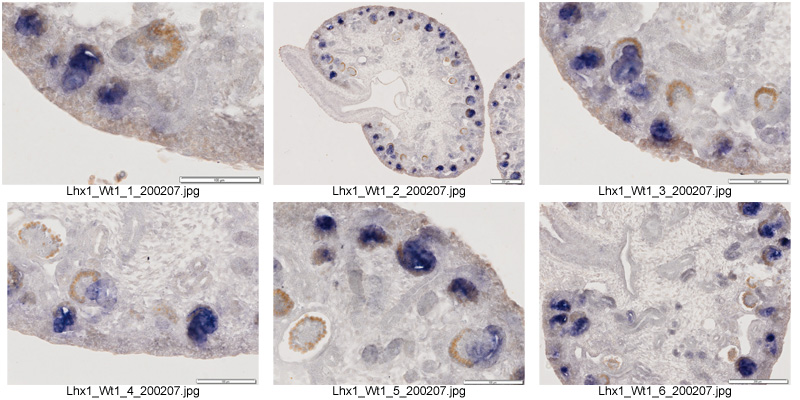 This specimen was generated and annotated by the lab of Melissa H. Little, Murdoch Children's Research Institute. This assay's probe was visualized using BM purple (blue). This section was also subjected to immunohistochemistry with an anti-Wt1 antibody visualized using DAB (orange).