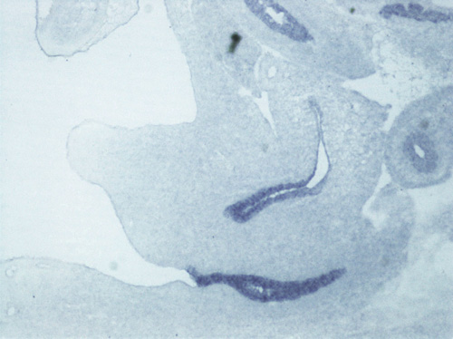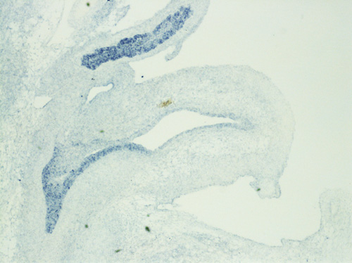 Note: This specimen was generated and annotated by the lab of Cathy Mendelsohn, Columbia University. Labeling was visualized using NBT/BCIP.