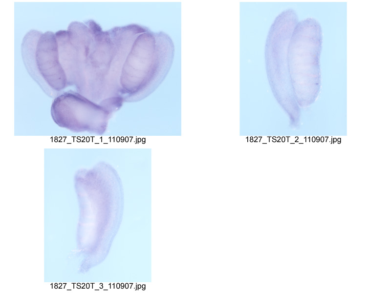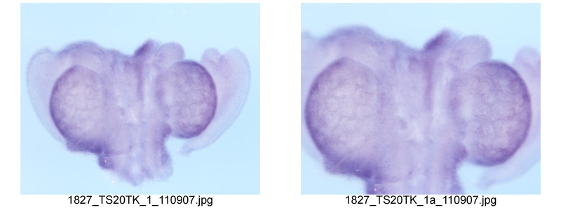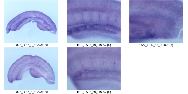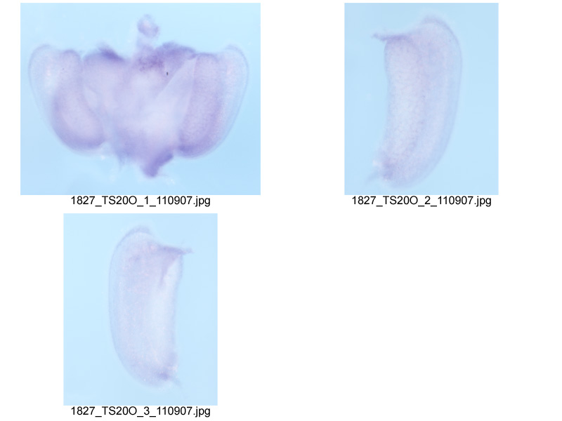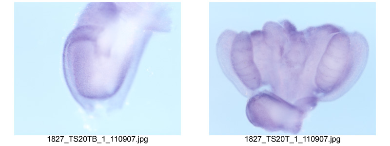 Note: This specimen was generated and annotated by the lab of Melissa H. Little, Murdoch Children's Research Institute. This animal was sexually mature. Visualized using BM purple. The low level expression control (Shh) probe's color developed for 98 hrs and strong expression could be detected. Thus, low levels of gene expression were detectable in this experiment. |